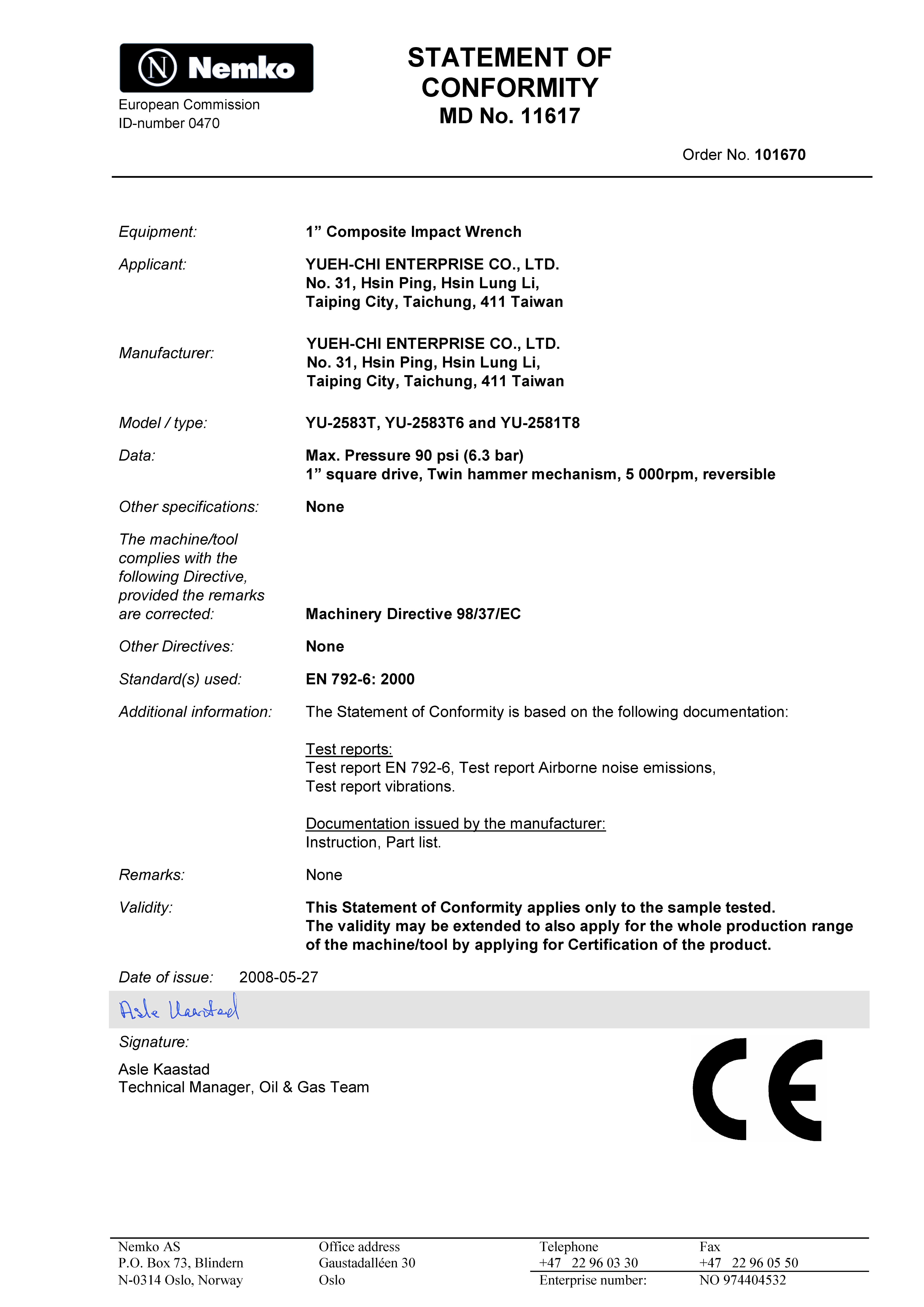 Obtained Machinery Directive 93/37/EC CE certificate issued by Nemko AS - 2002