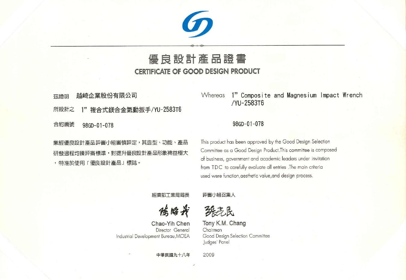 New 1" composite impact wrench was given Good Design Award by the Good Design Judging Committee. The main screening perspectives are function, aesthetic value, and design process.Nov. Under Industrial Development Bureau Ministry of Economic Affairs, YUEH CHI, SCORPIO completed with Conventional Industry Technology Development of high speed Composite Impact Wrench successfully.