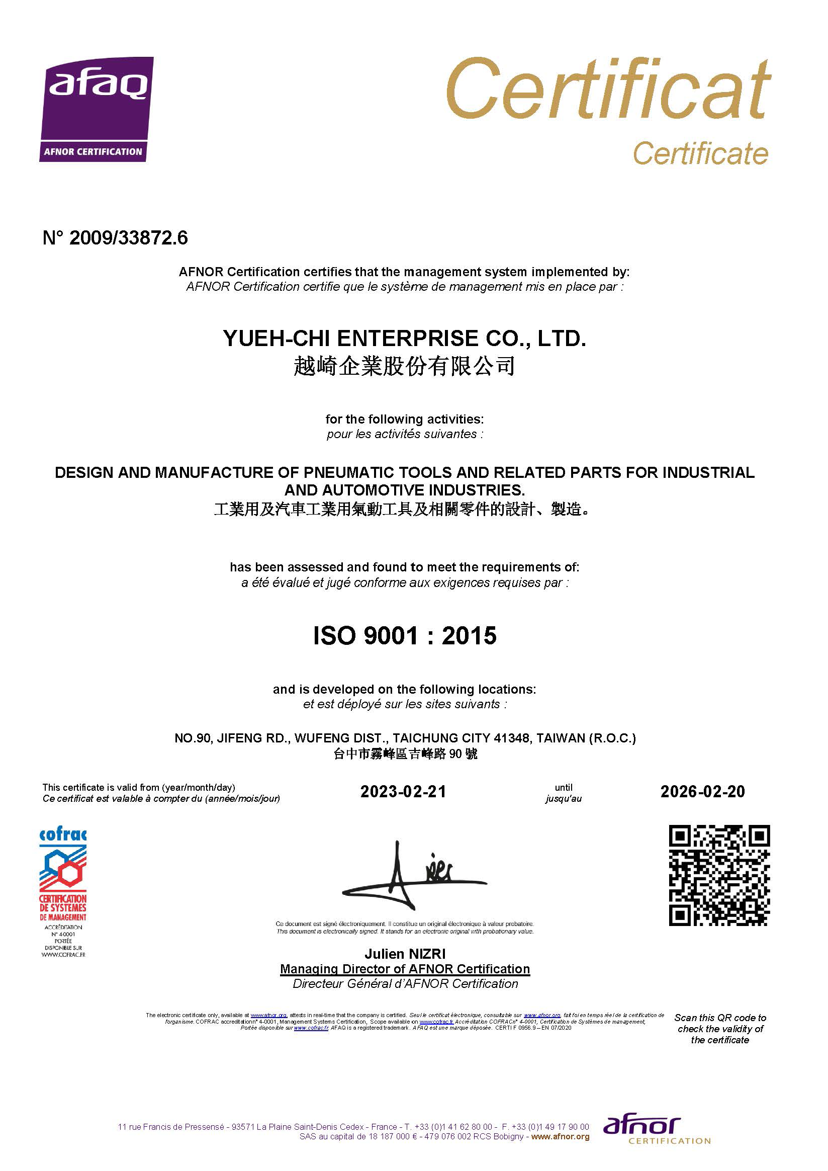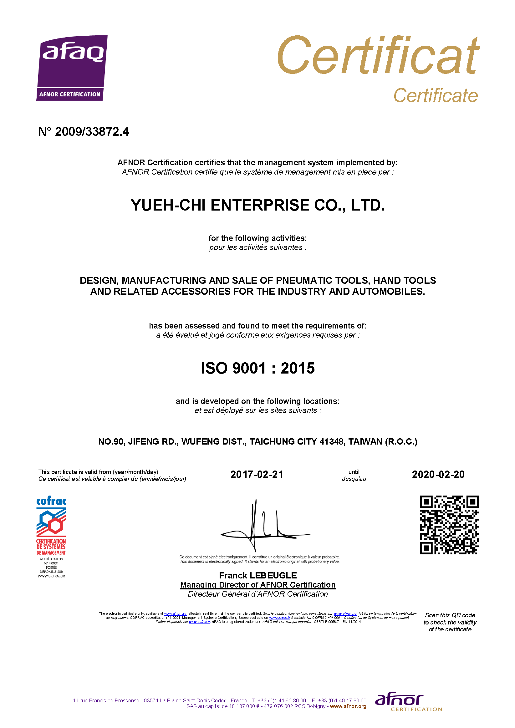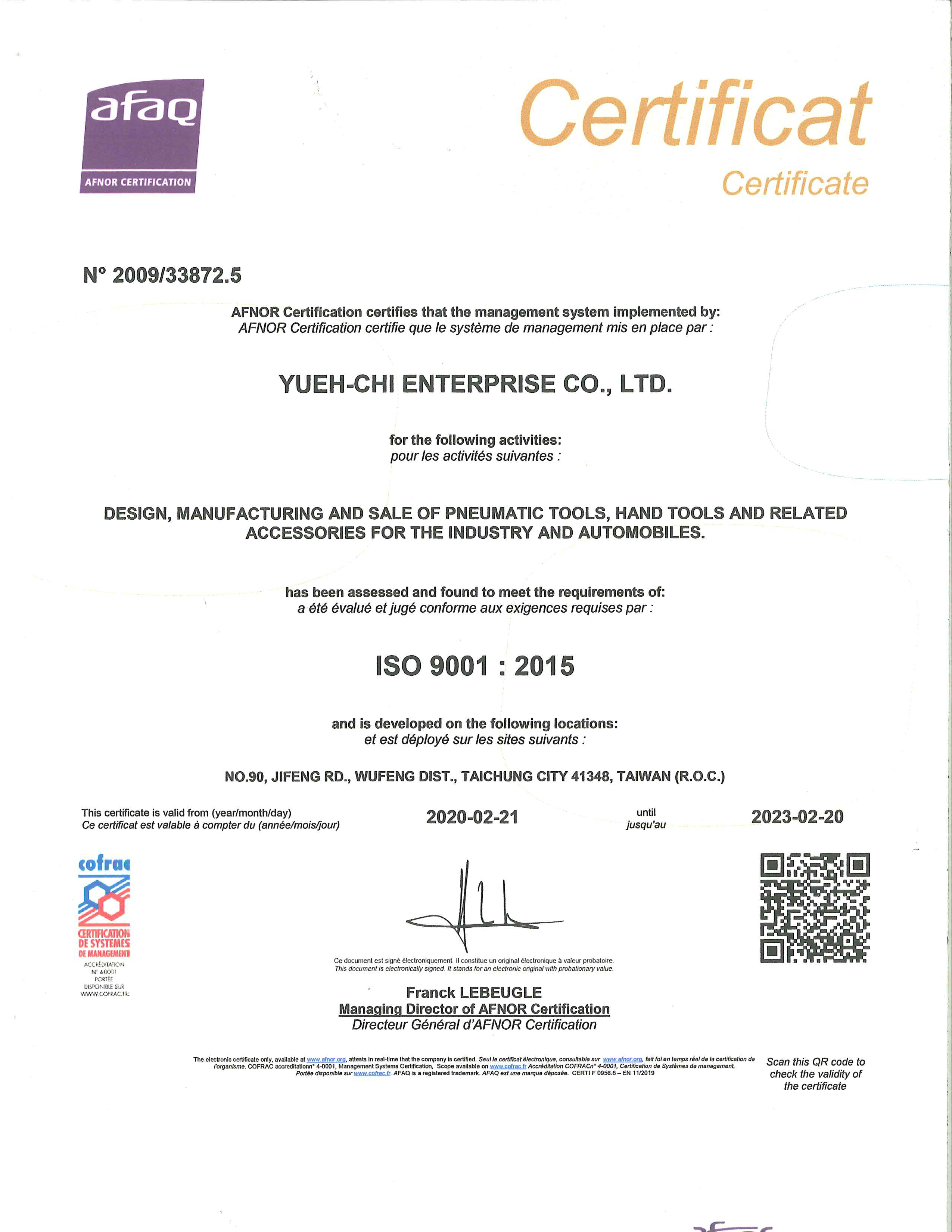 Feb. YUEH-CHI, SCORPIO was continuously certified with ISO 9001-2015 certificate.
