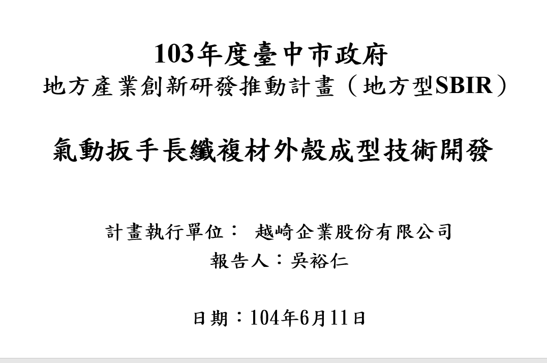 May. Under Taiwan's SBIR (Small Business Innovation Research) plan again, YUEH-CHI successfully pioneered innovative technologies for lightweight pneumatic impact wrenches using long fiber composite materials.